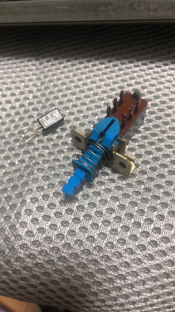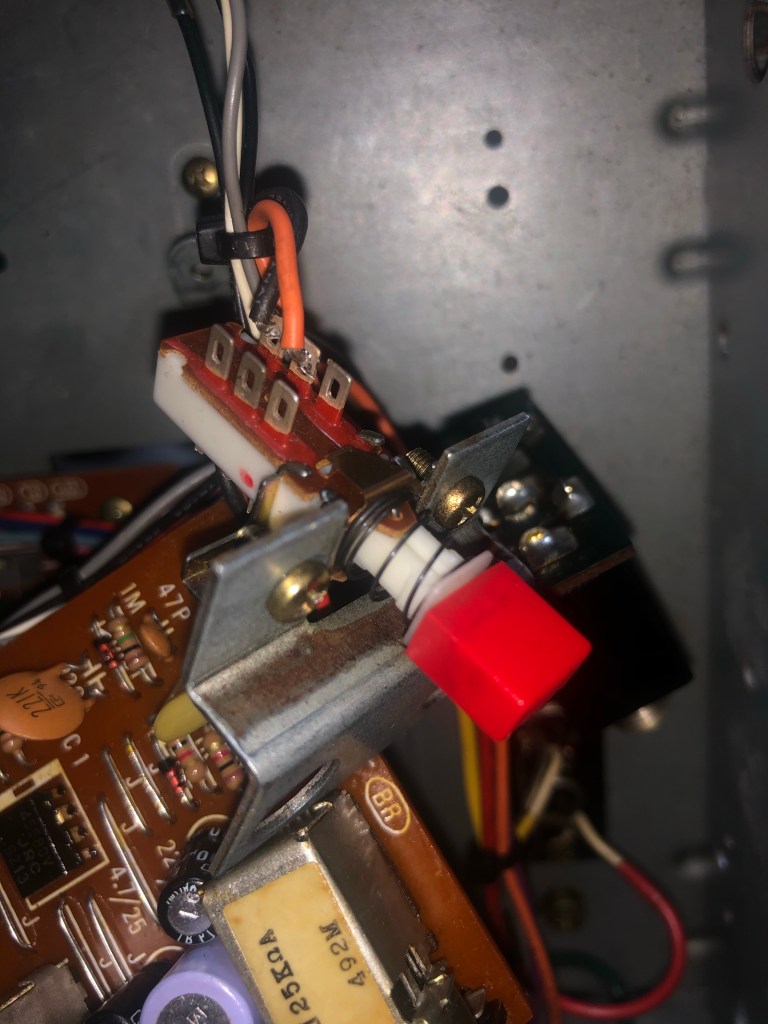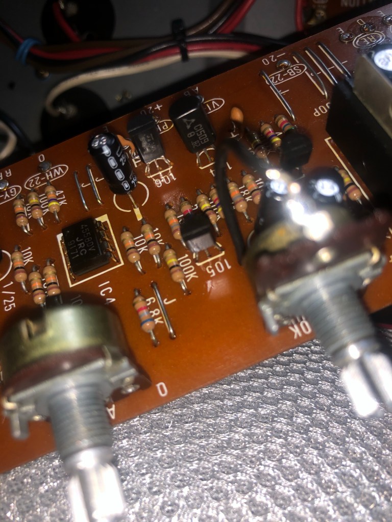 YAMAHAのアンプを修理する 投稿者:Hidehiro Tsubakihara2020年4月19日カテゴリー:未分類 YAMAHAのアンプG50-112の修理依頼、A,Bチャンネルの切り替えが上手くいかないとのこと 大概、スイッチの接触不良と思われるので似たようなSW(未使用品)をシャーシを加工してとりつけ。 スイッチを交換 切り替えに使っているトランジスタも不良だった… 不良のトランジスタとスイッチ。オリジナルのスイッチは樹脂が青いのだね。 はい、ちゃんと切り替えできます。 共有: X で共有 (新しいウィンドウで開きます) X Facebook で共有 (新しいウィンドウで開きます) Facebook いいね 読み込み中… 関連