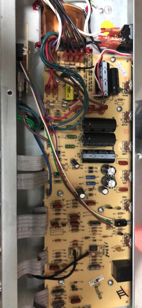 フェンダーBluesJuniorを修理する 投稿者:Hidehiro Tsubakihara2020年4月20日カテゴリー:未分類 依頼のアンプは出力管の一本が放電による高熱で印字が焦げていた… 電源部のコンデンサも怪しいので交換 電解コンデンサを一新 出力菅はペアなので、二本とも交換 見にくいけど、グリッド電圧も異常だったので、抵抗一本を交換 この抵抗一本で変な歪みの原因が解消 ブルースジュニアの回路図。この手のアンプは回路図があるから、解析が楽。 共有: X で共有 (新しいウィンドウで開きます) X Facebook で共有 (新しいウィンドウで開きます) Facebook いいね 読み込み中… 関連