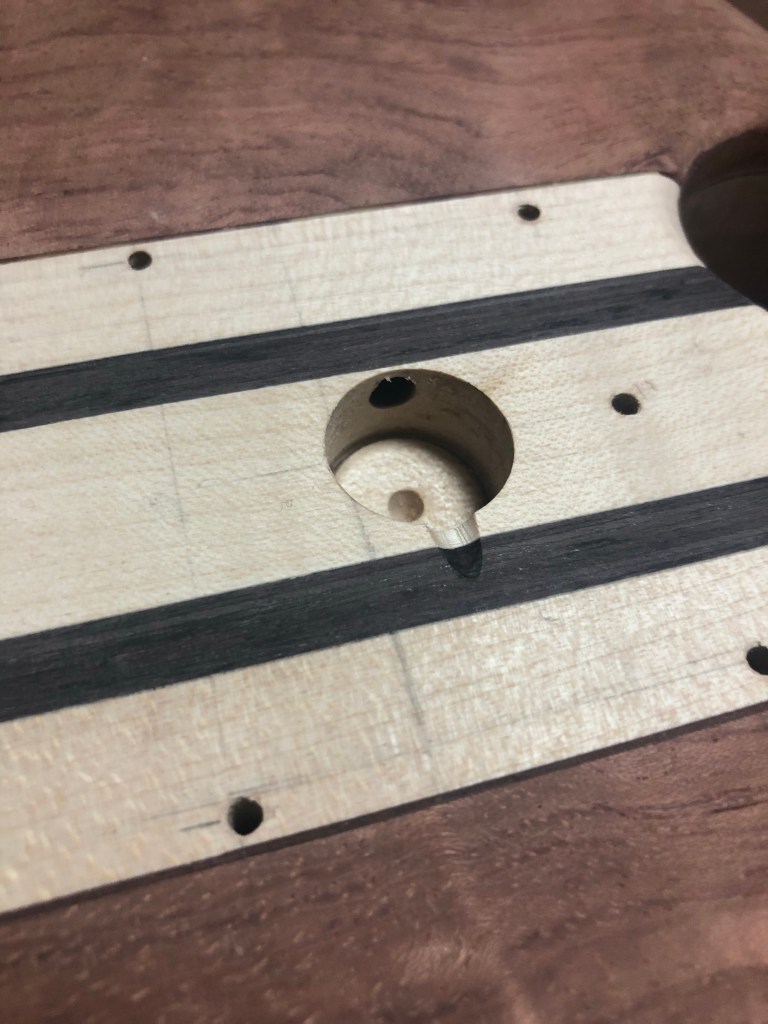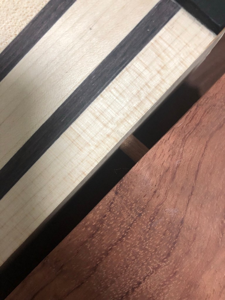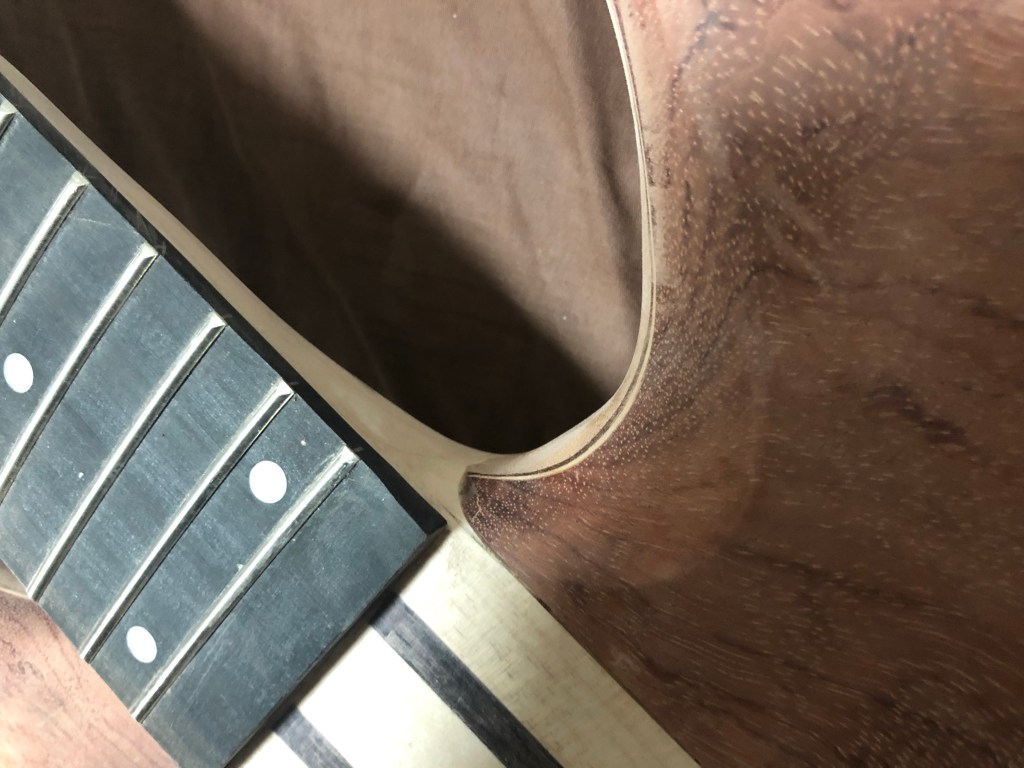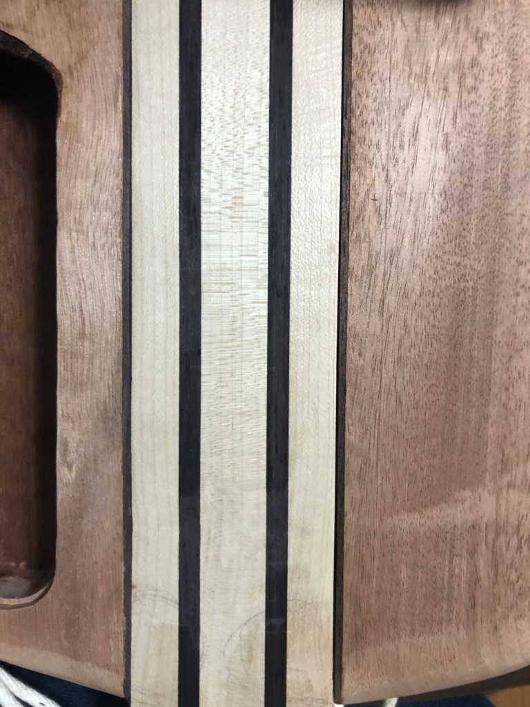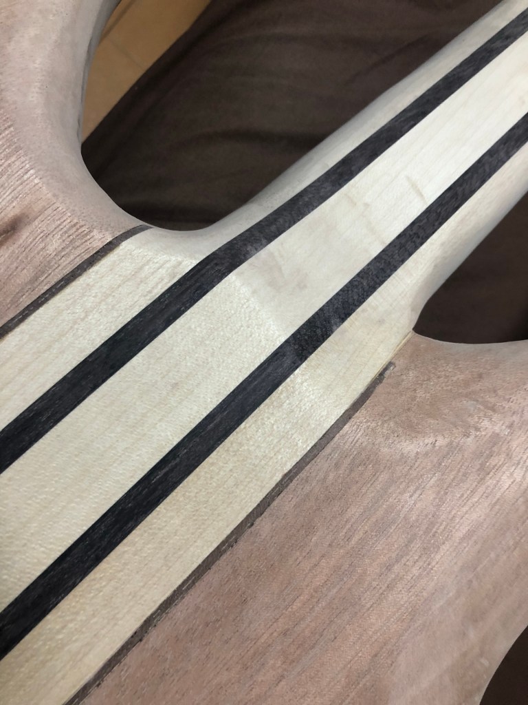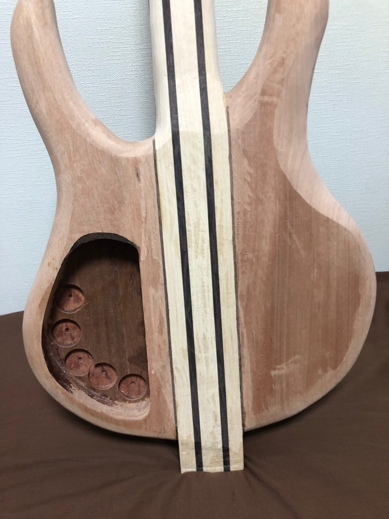 ベースキット 本体加工4 投稿者:Hidehiro Tsubakihara2020年4月20日カテゴリー:未分類 ボディウィングを取り付けする前にネック材とウィングをダボで固定する。 正確な位置決めの為、ダボ穴はネック材を貫通してます。 左ウィングを取り付け。 裏側のウィングの縁にウォルナットのバインディングを付ける。 ウィングとネックのあいだのウォルナットがアクセントになった。キャビティ内のくり抜きは、ボリュームポット用のくり抜き。 ネック材とウィングの繋ぎ部分。ここはサンダーが入らないので手作業て仕上げていく。 ネック材裏側、ヒールレスカットにしてみた。 ブリッジ用のネジ穴とアース線の通り道 共有: X で共有 (新しいウィンドウで開きます) X Facebook で共有 (新しいウィンドウで開きます) Facebook いいね 読み込み中… 関連