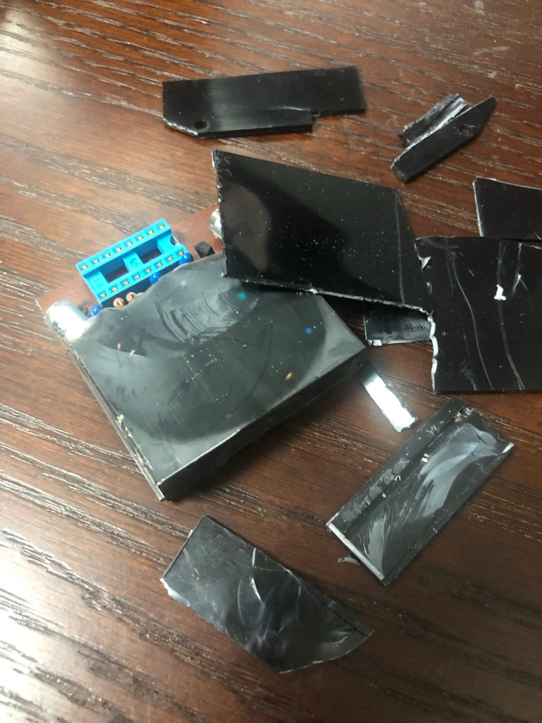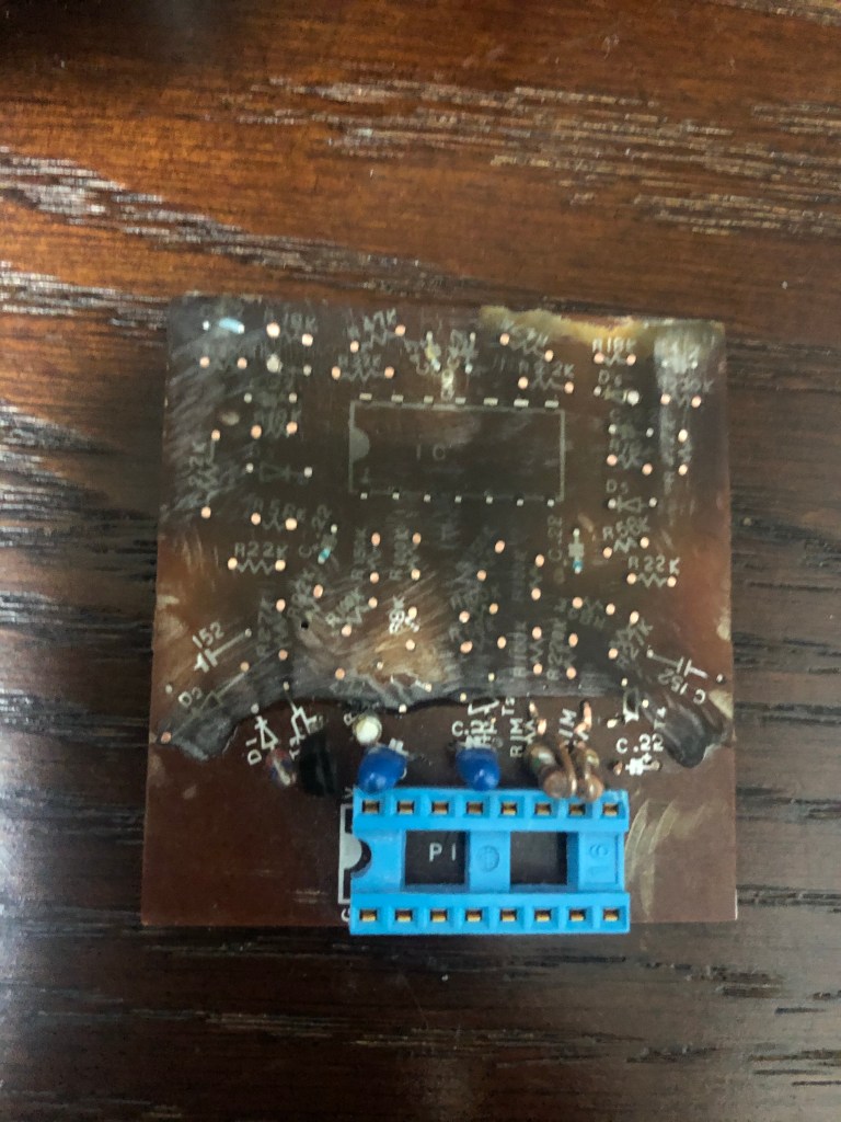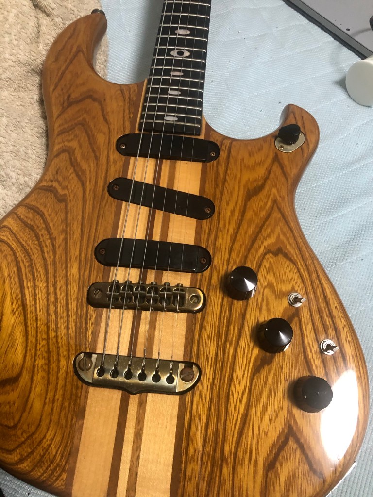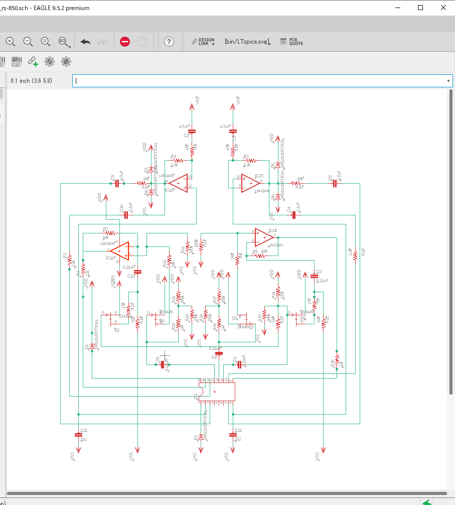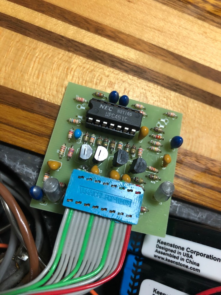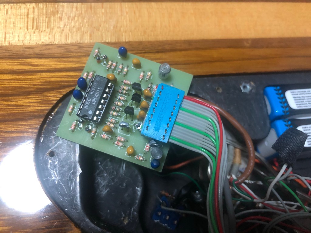 アリア RS-850のコントロール基盤を複製する 投稿者:Hidehiro Tsubakihara2020年11月30日2024年2月26日カテゴリー:未分類 樹脂でブラックボックス化されていたので、意を決してグラインダーで削ってしまう。 プラのケースを取り除いたところ。べっとりと樹脂で固めてあった。 裏面は、樹脂を上手く剥離出来た。 回路を推定してかく。※この回路は一部フィルターへの帰還が間違っている可能性があります。 回路検証するにも基板がないと…なのでワンオフで、さくっと作成した。 あり合わせの部品でとりあえず実装する。 ギターに装着。音が出た。フィルターも機能してるみたい。 一部のタンタルがリークしているようなので、新品に交換。FETも2SK44に。 十分な出力が得られているので、ギターに内蔵する。 アレンビックのオマージュだけど、よく出来たギターだと思います。 共有: X で共有 (新しいウィンドウで開きます) X Facebook で共有 (新しいウィンドウで開きます) Facebook いいね 読み込み中… 関連