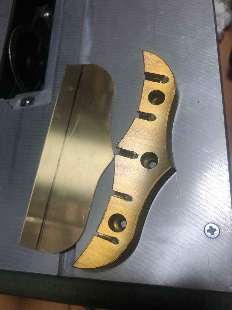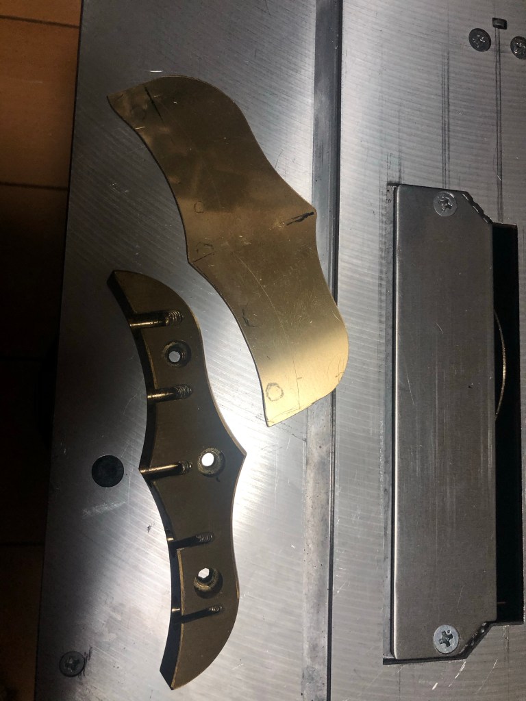 GK-3Bをマウントする 投稿者:Hidehiro Tsubakihara2020年11月30日2020年12月4日カテゴリー:未分類 アレンビックのヨーロッパ5弦にマウントしようと思う。テールピースの下にプレートを敷いてそれを土台とする。 1mmの真鍮板をカットする。バンドソーなどは使えない小ささなので、糸鋸で切る。 テールピースより後ろに大きくして、そのエリアに支柱を立てる予定。しかし真鍮の1mmは加工に結構、骨が折れる。 POPスペーサーを嵌め込む。とりあえず4本。 共有: X で共有 (新しいウィンドウで開きます) X Facebook で共有 (新しいウィンドウで開きます) Facebook いいね 読み込み中… 関連