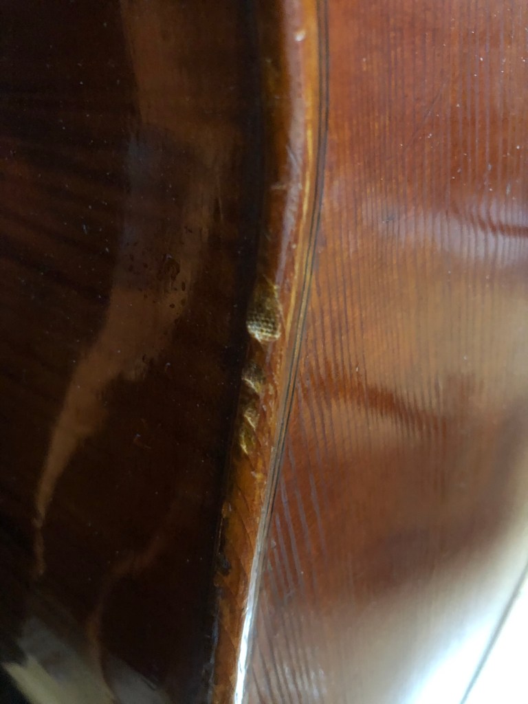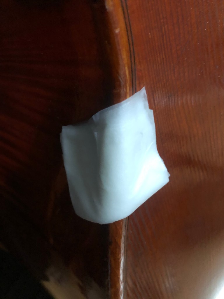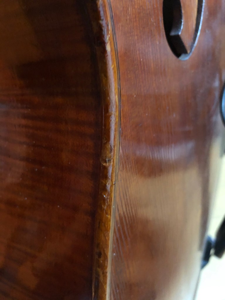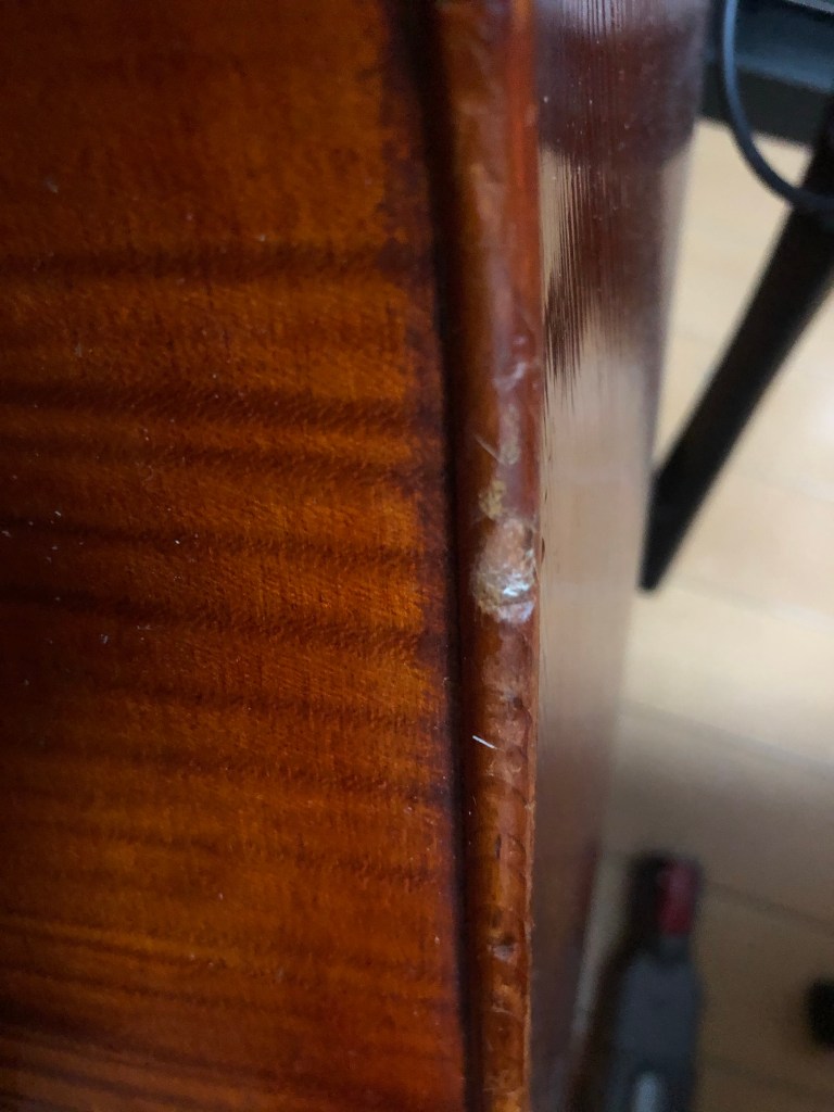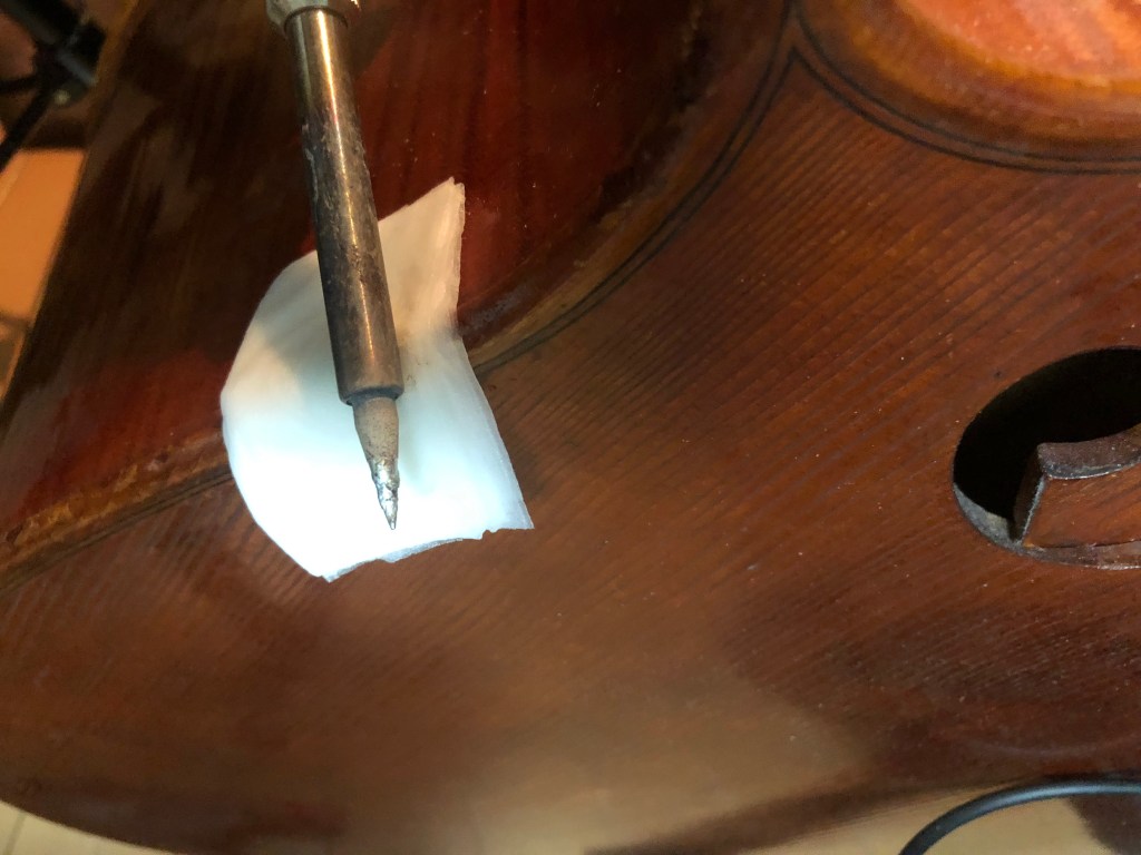 コントラバスのキズ簡易修理 投稿者:Hidehiro Tsubakihara2021年2月22日2021年2月22日カテゴリー:未分類 何かにぶつけたようです。生地の跡があるから、たぶんソフトケースの上から当たった様子。 濡れたティッシュを当てます。 はんだコテを当ててます。 蒸気がでてティッシュが乾いて焦げる寸前まで加熱します。 かなり戻りました。後はニスを塗ります。 湿らせて、復元したので乾いてからニスを塗ります。だいぶ分からなくなりました。 共有: X で共有 (新しいウィンドウで開きます) X Facebook で共有 (新しいウィンドウで開きます) Facebook いいね 読み込み中… 関連