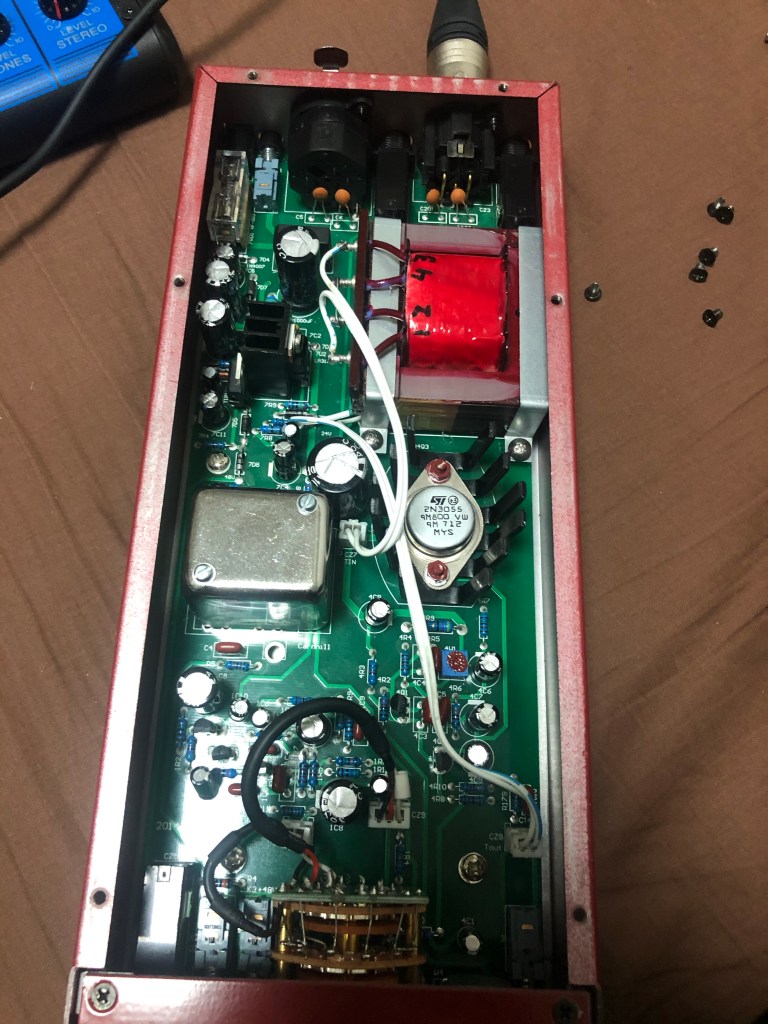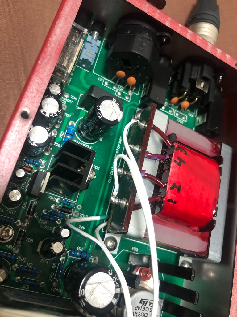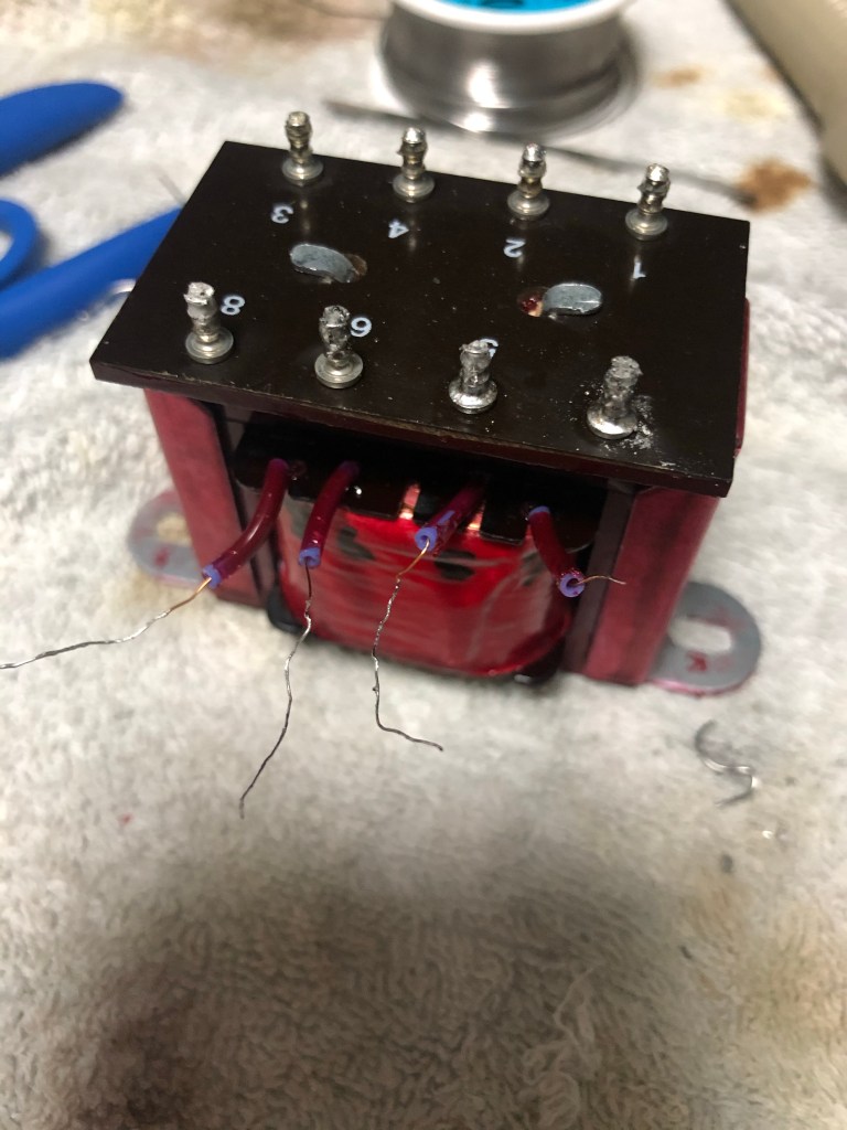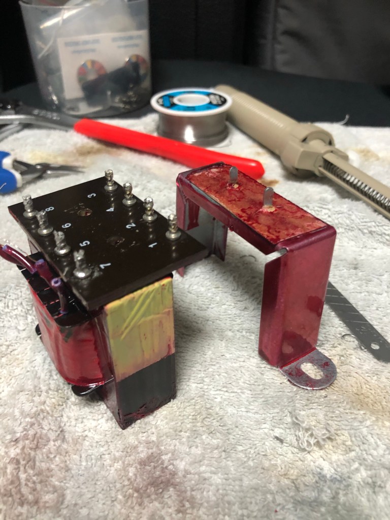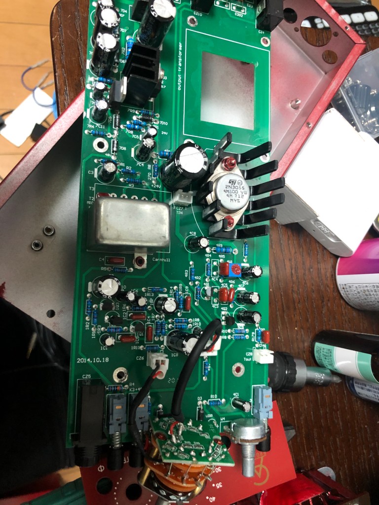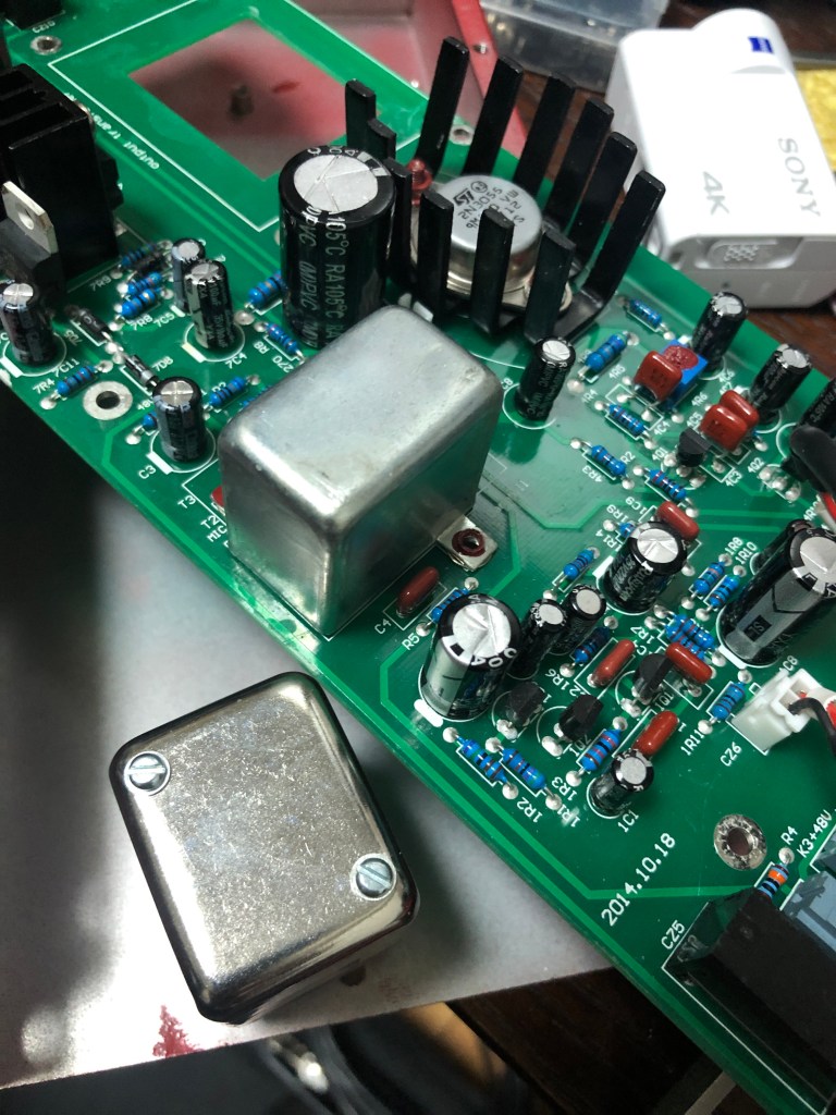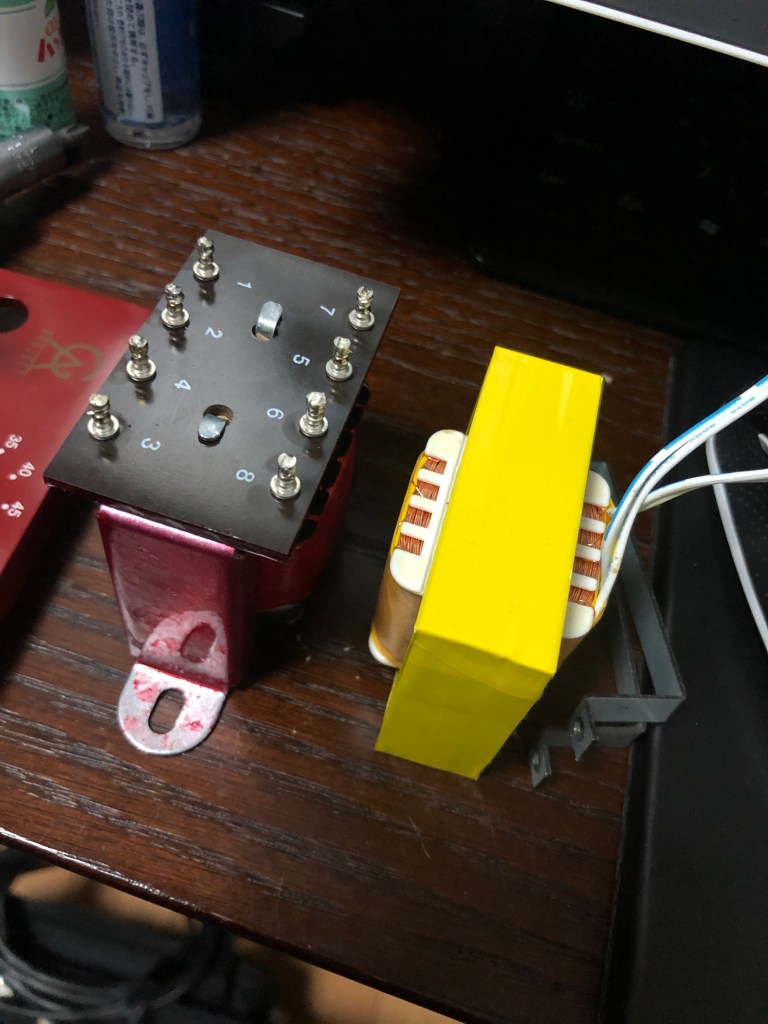 とりあえずバラし。出力トランス。左がcarnhillのもの。このままではケースに収まらない。インプットトランスも交換。これもcarnhillのもの。これはぽん付けできる。向きに注意…まずは端子板を外し、フレームを取れるようにする。フレームを外した。インプットトランスはこの空きスペースに取り付けする。出力トランスは、もとのトランスの取り付け金具を使ってとりつけ。端子板は半分にカットし、5,6,7,8端子は直接リード線とつなぐ。入力トランス、出力トランスともにcarnhillに交換した、GAP pre 73jr