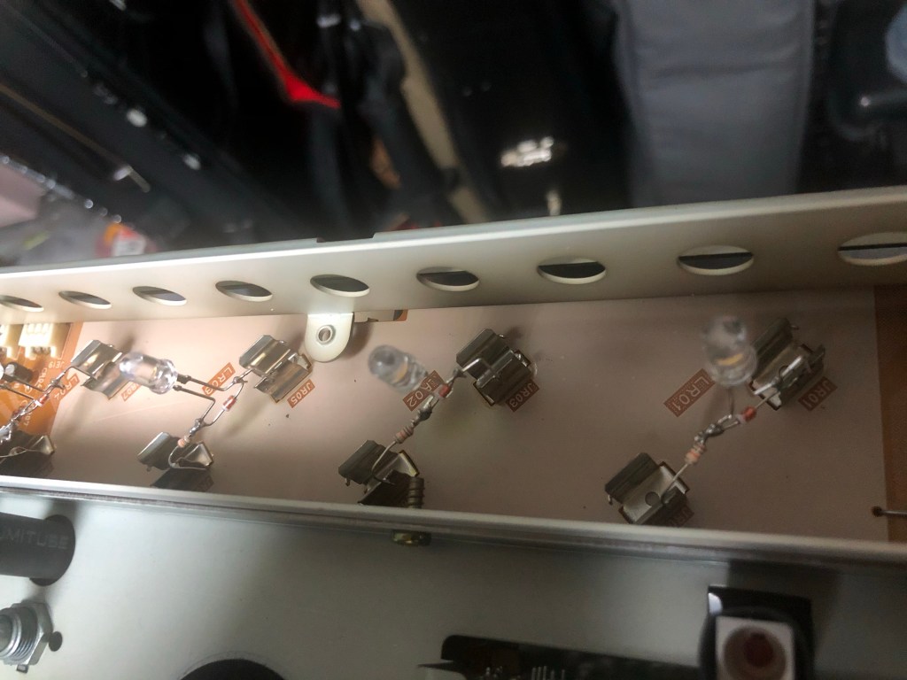 Boseのアンプのレストア 投稿者:Hidehiro Tsubakihara2021年4月8日カテゴリー:未分類 Boseのアンプを預かった ランプがつかないのでBOSEの文字が浮かびあがらないし、動作してるかわからない… 電球色のLEDをこの様に加工する。電球の電源はAC12Vぐらいだったので、逆電圧用のダイオードをつけておく 電流制御用の抵抗をつけ、もとのフューズ型電球のソケットに半田付けする。 ちゃんと光る。ちょっと暗めの方が電球らしい。 BOSEの文字のライトアップ。これで動作しているかよく分かる。 共有: X で共有 (新しいウィンドウで開きます) X Facebook で共有 (新しいウィンドウで開きます) Facebook いいね 読み込み中… 関連