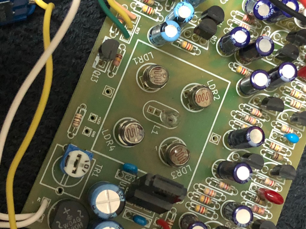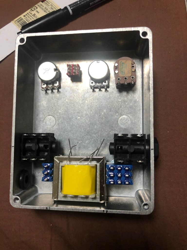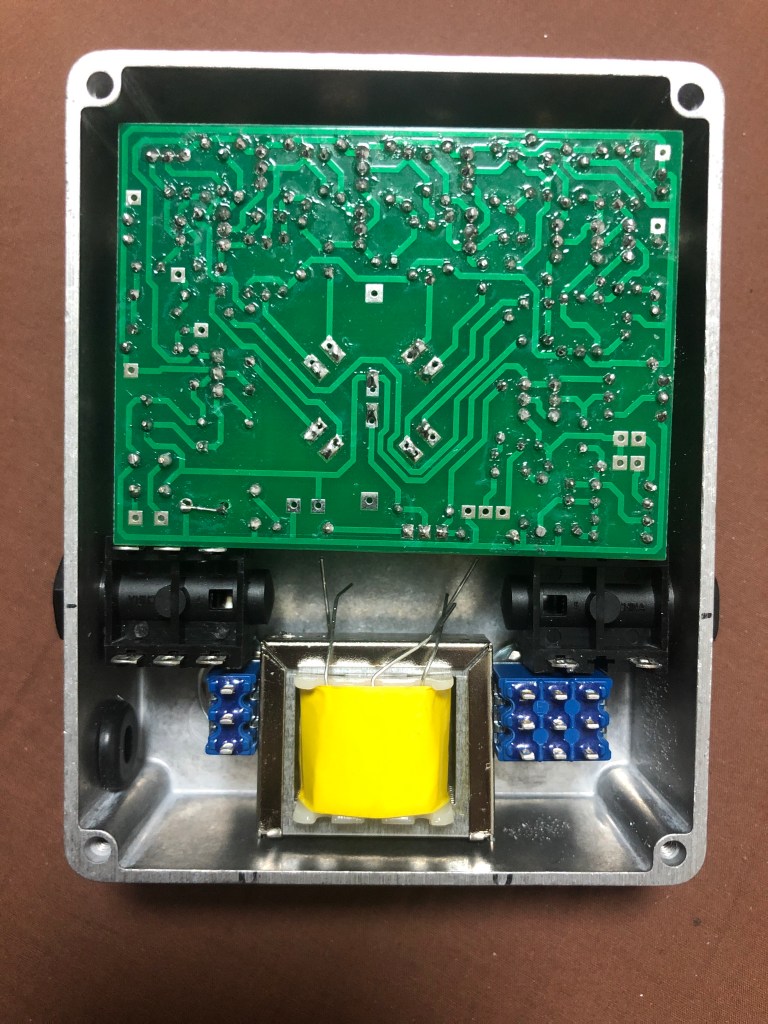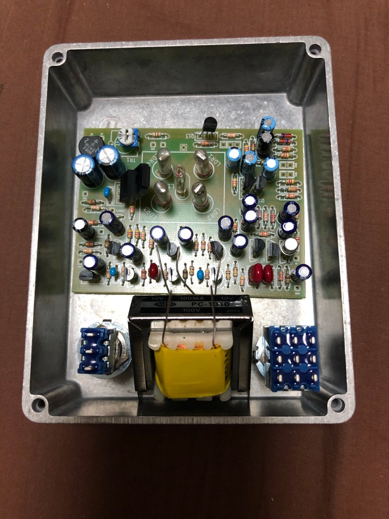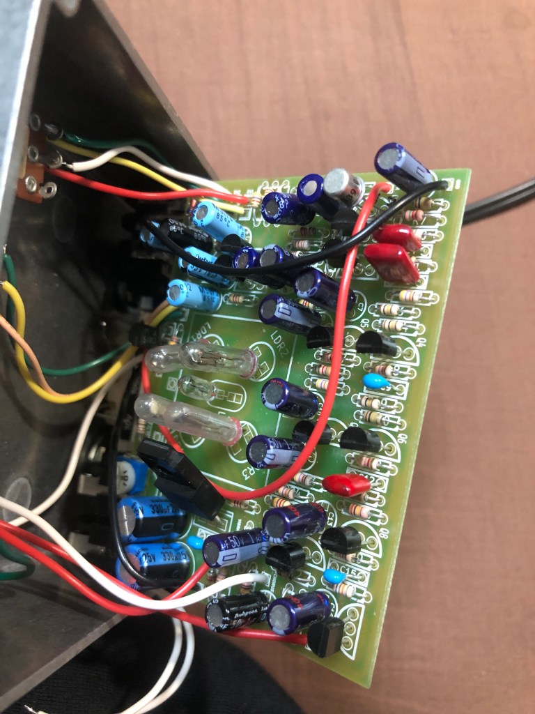 Uni Vibeなるもの 投稿者:Hidehiro Tsubakihara2021年4月29日2021年6月13日カテゴリー:未分類 その昔、Uni Vibeという、アナログエフェクター があった。CDSと電球でモジュレーションかけるという回路構成。ひょんなことからCDSを入手したので、これを使ったエフェクター はないかと調べていたら見つけた。 もうだいぶ実装してしまったが、基板はポーランド製、輸入した。 ポーランドのギターエフェクター のキットを販売しているところから輸入。トランジスタが米国製を想定しており、端子配列が日本のものと違うので注意が要る Uni Verbの心臓部、ガラス菅入りCDS。中央のガラス菅はメーター用のランプ。フィラメントが縦長なので採用した。長期保存されていたせいかCDSのガラス菅はくすんでいるし、リードはハンダが乗らない。その上、リードの向きと内部のセルの向きがバラバラでねじって付けないとランプに向かない。 自作エフェクター のケースの定番ハモンド1590のケースに基板外のパーツを収めてみる。AC100V駆動なので電源トランスをいれたのでキツキツ。 基板の部品高さがかなりあるのでコントロールも上に逃している。 ちょっと間延びした顔になった。ロゴマークやネームを作ってごまかそう。 トランジスタのBD681でランプを駆動するのだが、入手難しく2SC1815を使った。BD681は2n5088と違ってピン配置が2SC1815とおなじ。ランプは当初のメーター用の長いフィラメントから、麦球ランプに変更。 CDSを変更した。縦長のはガラス管の汚れが取れなかったのと、ノイズが多いように感じたので。また電源トランスを内蔵していたが、これもハムノイズのためアダプター式に変更。このCDSは反応が早いためLED電灯のダイナミック点灯をノイズとして拾っているため、調整は暗闇でしなくてはならない… 共有: X で共有 (新しいウィンドウで開きます) X Facebook で共有 (新しいウィンドウで開きます) Facebook いいね 読み込み中… 関連