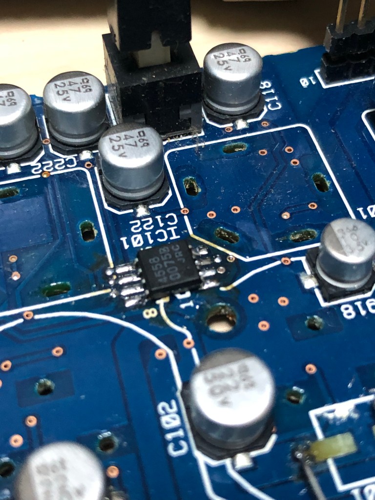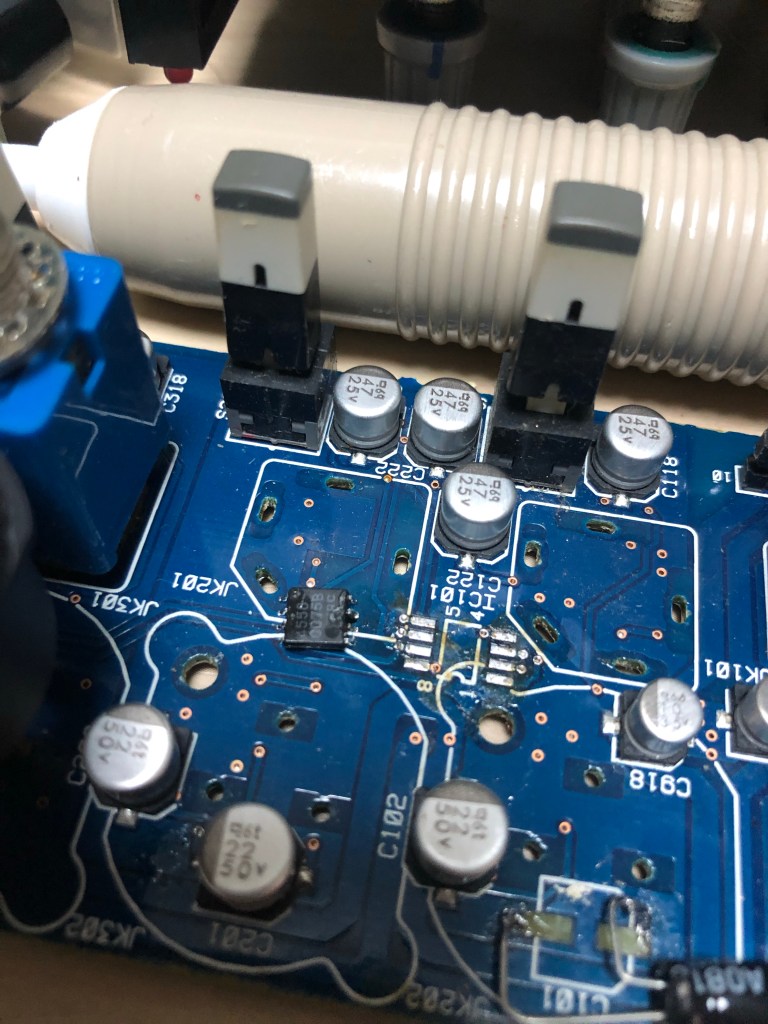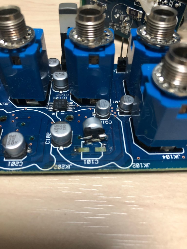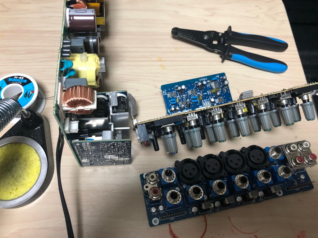 ヤマハステージパスの修理 投稿者:Hidehiro Tsubakihara2021年11月18日カテゴリー:未分類 筐体に入ったままでは、回路チェックも出来ないので、バラック状態にする。 なぜかもう修理した跡が…ケミコンの基板パターンが剥がれてない! 幸いスペースは沢山あるので、リード型のケミコンを取り付ける 1,2chを取りまとめているのが、このオペアンプ。今回は2chのみ音が出ないとの事なのでコイツを交換してしまう。これの交換の為にフォーンジャックやXLRを全部外さないといけない。面倒である。 手持ちで面実装の4558があったので、そのまま交換。072や022もあったが、オリジナルと同じ部品にした。 共有: X で共有 (新しいウィンドウで開きます) X Facebook で共有 (新しいウィンドウで開きます) Facebook いいね 読み込み中… 関連