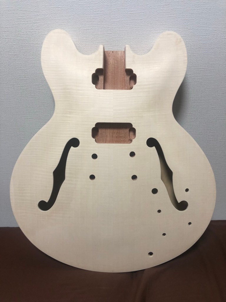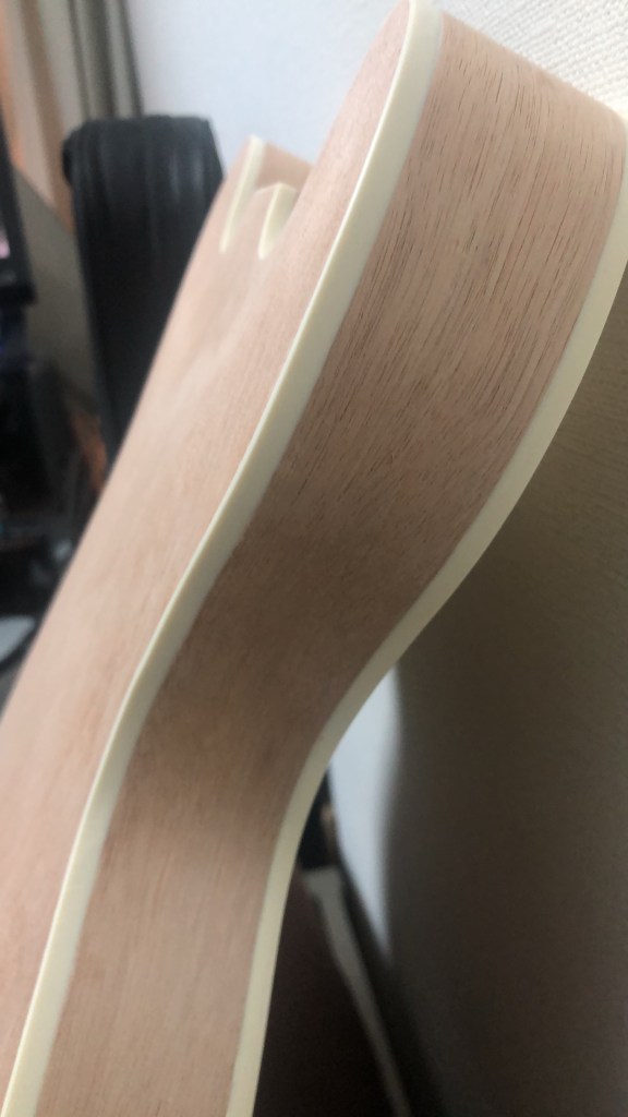 ES335のキット組み立て 投稿者:Hidehiro Tsubakihara2022年2月4日2022年2月10日カテゴリー:未分類 Stewmacでセミアコキットを購入。トップは一応虎杢 バックはマホガニー。目止めが大変そう… レモンイエローに塗る。ちょっと虎杢出て来た。 マホガニーブラウンでサンバーストにする 一度、拭き取り、再度エアブラシで吹く 染料定着のため、シーラーを吹く。 バックはブラウンを着色 ヘッドは、窪みをつけて雰囲気はギブソン あ、ネックヒールが寸足らず… 付属品のプラ板はあまりにチープ 紫檀の端材で作ろう ネックを取り付けよう。若干のスキマがあるので、しっかりと糸でセンター出し。 共有: X で共有 (新しいウィンドウで開きます) X Facebook で共有 (新しいウィンドウで開きます) Facebook いいね 読み込み中… 関連