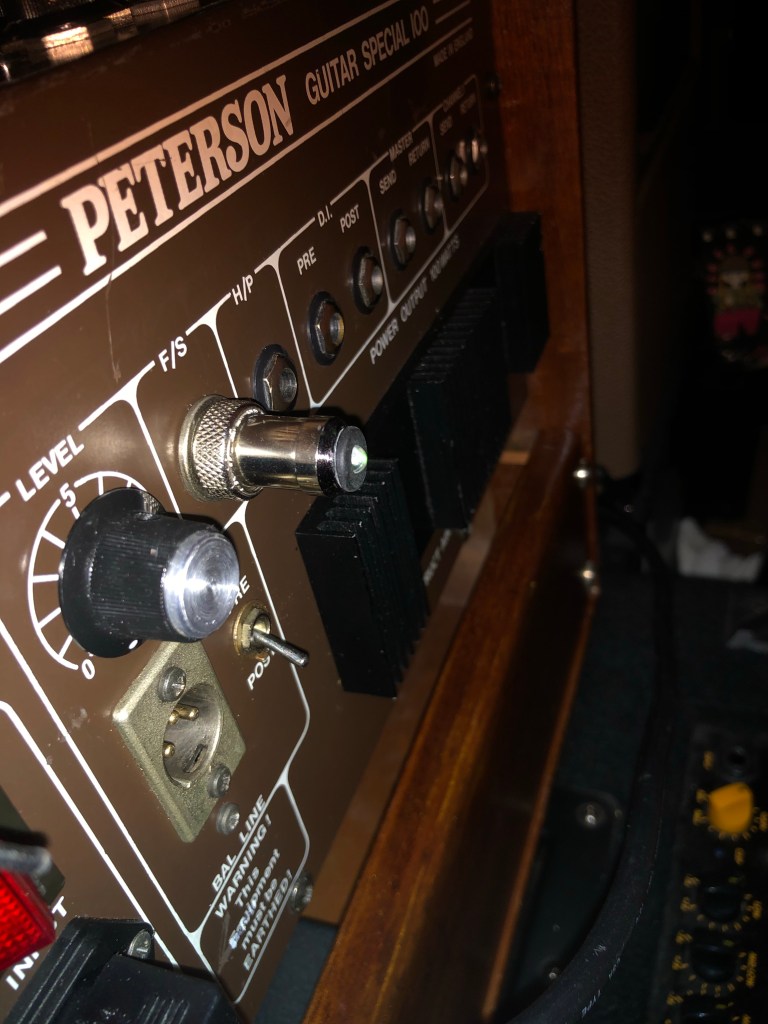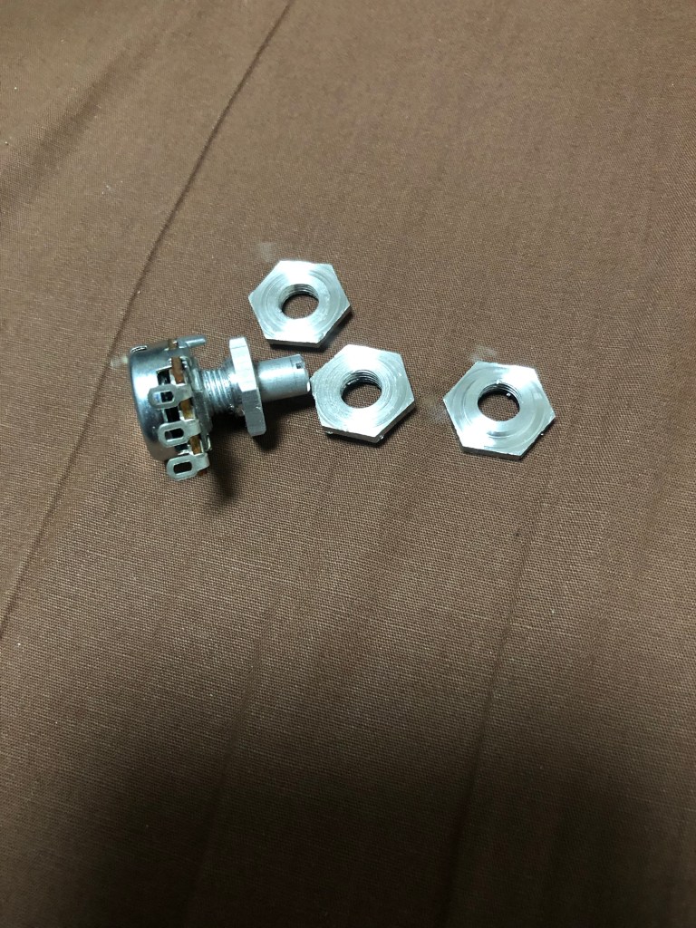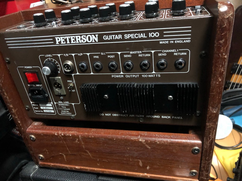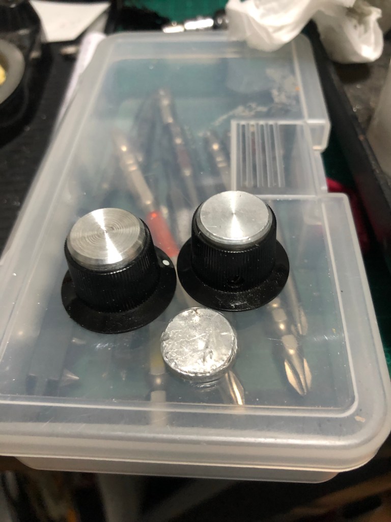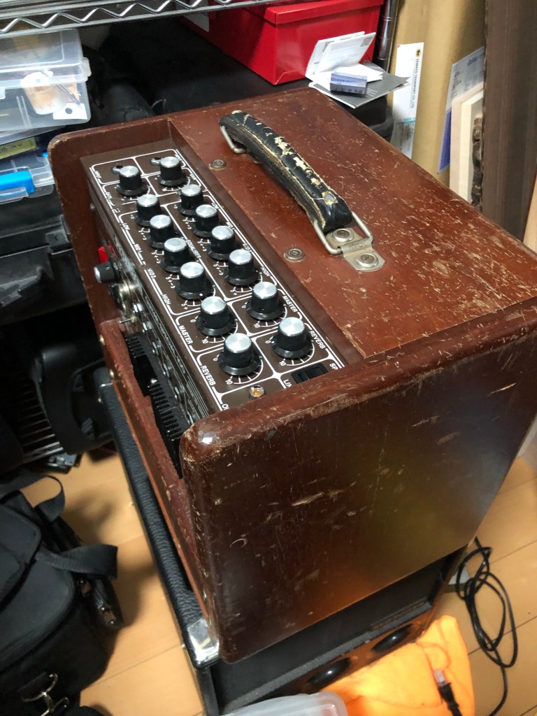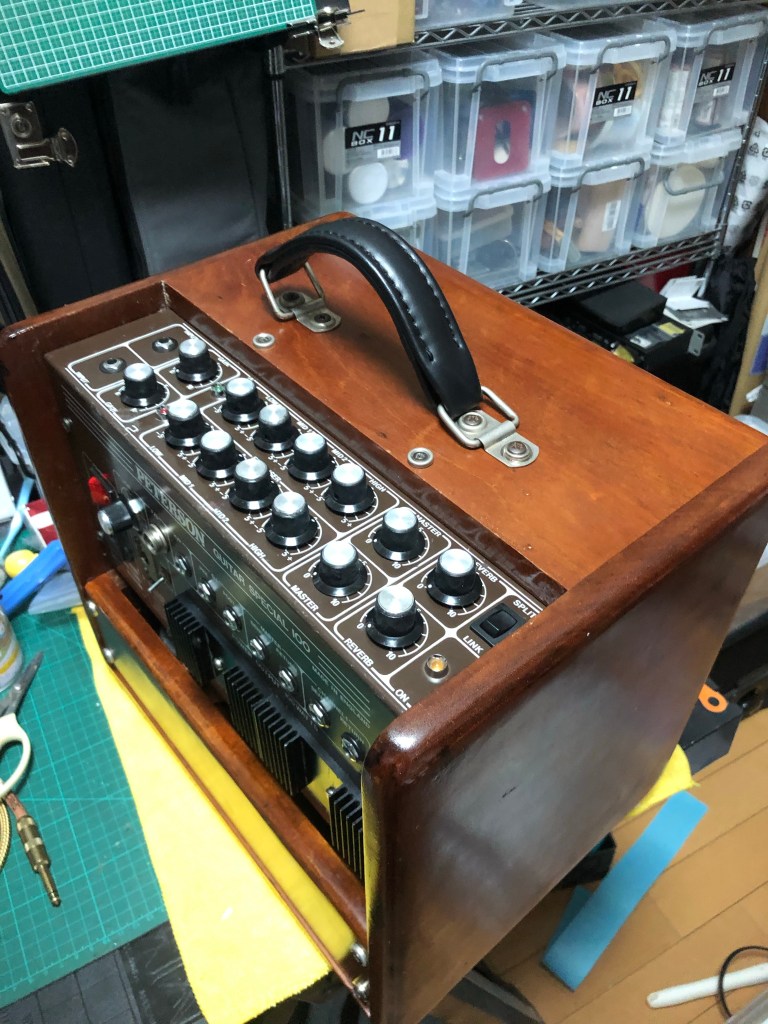 ピーターソン P100Gレストア 投稿者:Hidehiro Tsubakihara2022年7月17日2023年2月3日カテゴリー:未分類 ピーターソンのアンプを入手 キャビネットは傷だらけ、Gainとmasterにガリはあるが、音は出る。リヴァーブも効く エレクトロボイスのロゴもなく、トロイダルトランスが底についてるから、初期型かな。 スピーカー、メーカー不明だが、25cmにしてはマグネットデカい。 スピーカー前面、エッジもそれほど傷んでなく、まあ、このまま使えるでしょう。 修理した形跡なし、いや基板ごと交換してたらと思ったが、ボリュームもオリジナルだし、貴重な初期型なのかもしれぬ。 キャビネットの凹みを直してみる。 濡らした不織布とはんだこてで 凹んでるだけなら、蒸気の力で膨らんでくれる。だけど削れて無くなってるのは無理 ボリュームノブの凹みがひどい。 薄いアルミのキャップのようだ 外すことができるので、叩いて直すか? 旋盤でアルミ棒を削り、キャップを作ることにした。 窪み深さは、2.0mmぐらい要るかな… 左のキャップが旋盤削り出しのもの。右は、当て傷でベコベコになったキャップ。 ちょい高さが高いのが出来てしまったが、まあよしとしよう。 結局、6個作りました。 旋盤を引っ張り出したので、ついでに六角棒を切削 交換予定のボリュームのナットにする。交換部品のボリュームの取り付け軸寸法が元のより細いので、そのまま取り付けると、中心に軸がこない。そのため、短いカラー付きのナットを作成する。 ネジは、7mmの0.75ピッチとちょい特殊。国産のボリュームはこのネジ寸法。 こんなナットをつくる。 四つ作った。 塗装をやり直し、組み付け。ハンドルも変えた。 トランスノイズを拾うのでシールドケースを作った。 ここに被せる。 フットSW無しでリバーブが効くよう、プラグを作った。先端にLEDを付けている。 共有: X で共有 (新しいウィンドウで開きます) X Facebook で共有 (新しいウィンドウで開きます) Facebook いいね 読み込み中… 関連