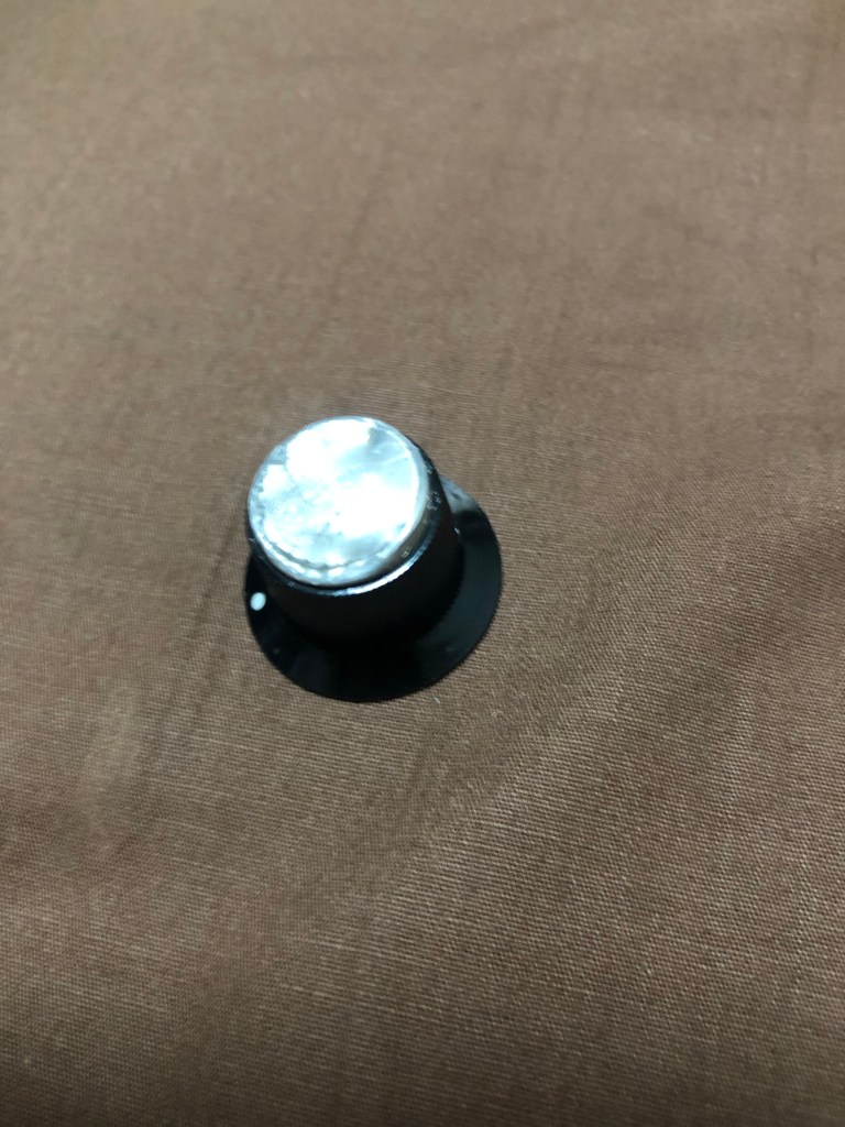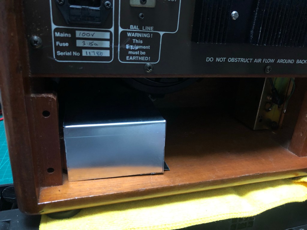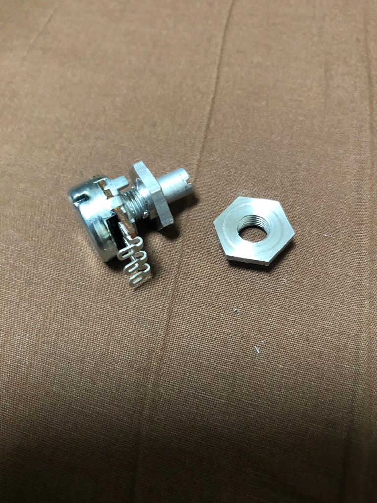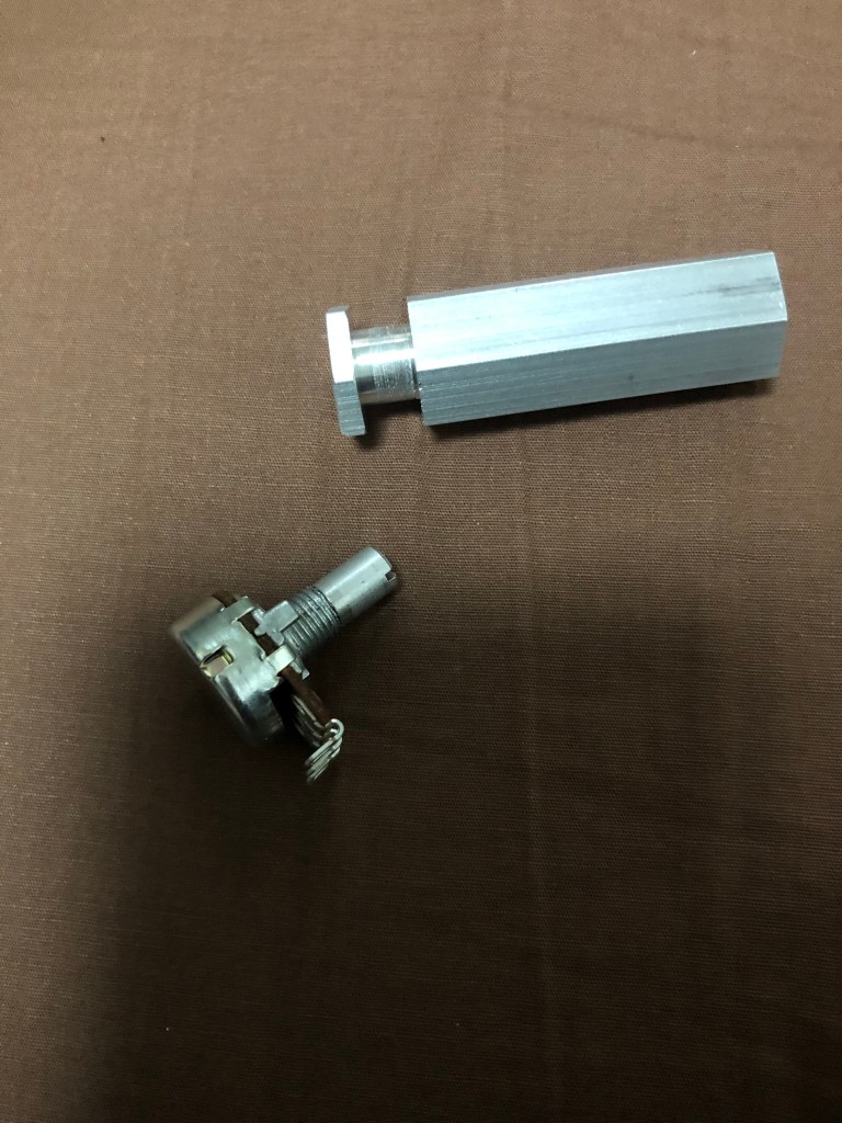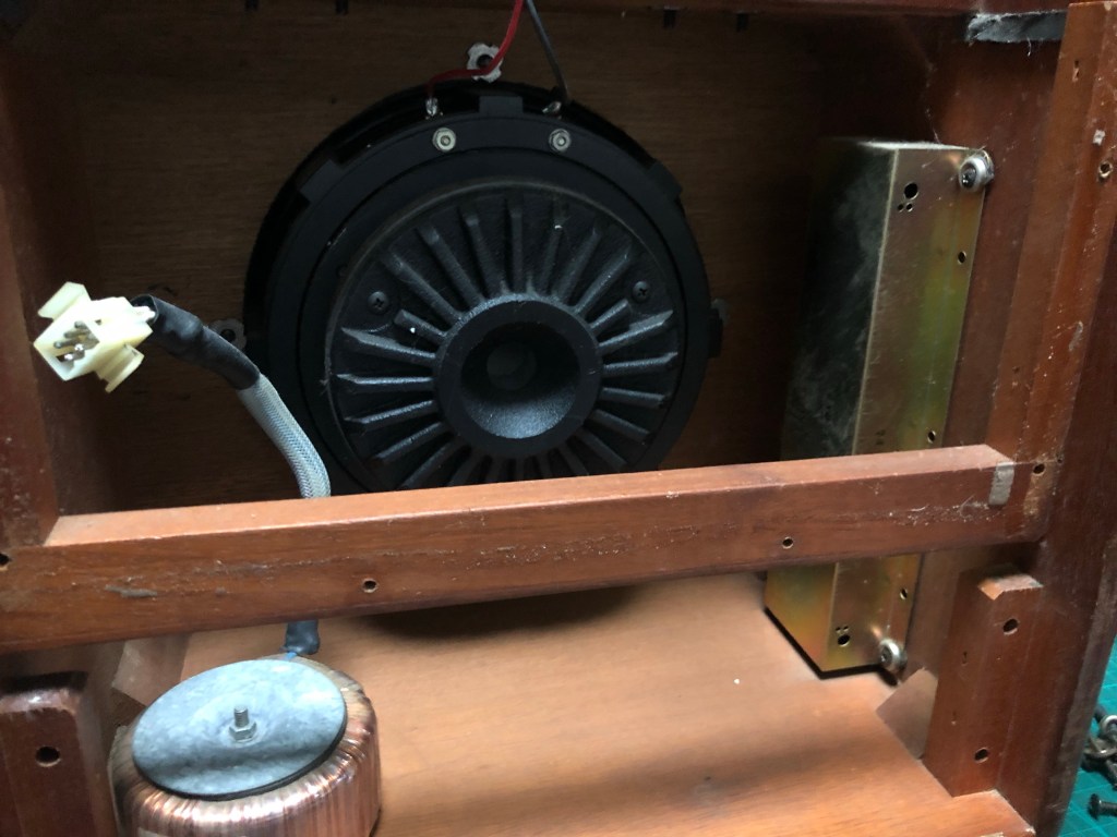ピーターソン P100Gレストア 投稿者:Hidehiro Tsubakihara2022年7月17日2023年2月3日カテゴリー:未分類 ピーターソンのアンプを入手 キャビネットは傷だらけ、Gainとmasterにガリはあるが、音は出る。リヴァーブも効く エレクトロボイスのロゴもなく、トロイダルトランスが底についてるから、初期型かな。 スピーカー、メーカー不明だが、25cmにしてはマグネットデカい。 スピーカー前面、エッジもそれほど傷んでなく、まあ、このまま使えるでしょう。 修理した形跡なし、いや基板ごと交換してたらと思ったが、ボリュームもオリジナルだし、貴重な初期型なのかもしれぬ。 キャビネットの凹みを直してみる。 濡らした不織布とはんだこてで 凹んでるだけなら、蒸気の力で膨らんでくれる。だけど削れて無くなってるのは無理 ボリュームノブの凹みがひどい。 薄いアルミのキャップのようだ 外すことができるので、叩いて直すか? 旋盤でアルミ棒を削り、キャップを作ることにした。 窪み深さは、2.0mmぐらい要るかな… 左のキャップが旋盤削り出しのもの。右は、当て傷でベコベコになったキャップ。 ちょい高さが高いのが出来てしまったが、まあよしとしよう。 結局、6個作りました。 旋盤を引っ張り出したので、ついでに六角棒を切削 交換予定のボリュームのナットにする。交換部品のボリュームの取り付け軸寸法が元のより細いので、そのまま取り付けると、中心に軸がこない。そのため、短いカラー付きのナットを作成する。 ネジは、7mmの0.75ピッチとちょい特殊。国産のボリュームはこのネジ寸法。 こんなナットをつくる。 四つ作った。 塗装をやり直し、組み付け。ハンドルも変えた。 トランスノイズを拾うのでシールドケースを作った。 ここに被せる。 フットSW無しでリバーブが効くよう、プラグを作った。先端にLEDを付けている。 共有: X で共有 (新しいウィンドウで開きます) X Facebook で共有 (新しいウィンドウで開きます) Facebook いいね 読み込み中… 関連