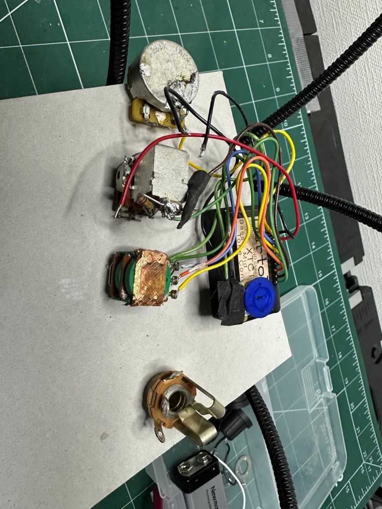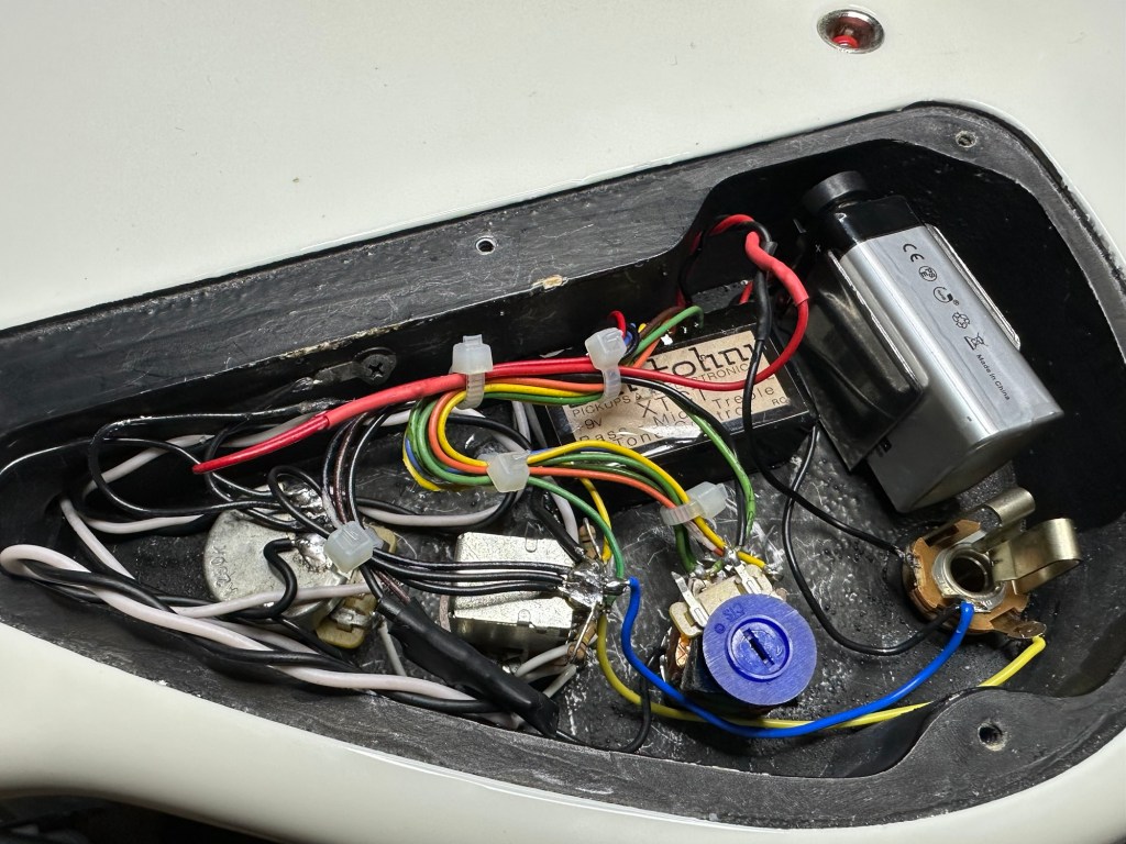 アトリエZのムスタングベース リワイヤリング 投稿者:Hidehiro Tsubakihara2025年2月23日カテゴリー:未分類 もともとの配線。バルトリニのプリアンプが入っているが、配線が間違っているのか、ボリュームをゼロにしても音がでる?との不具合 ベースから取り外してリワイヤリング タイラップを使い、見た目に美しく 電池フォルダも使い、配線をまとめた。2Volとスタックポットのトーン、リアのVolを引くとプリアンプバイパスされます。電池はUSB充電式のものでしたが、ノイズの点からは普通の乾電池がよいかと… 共有: X で共有 (新しいウィンドウで開きます) X Facebook で共有 (新しいウィンドウで開きます) Facebook いいね 読み込み中… 関連