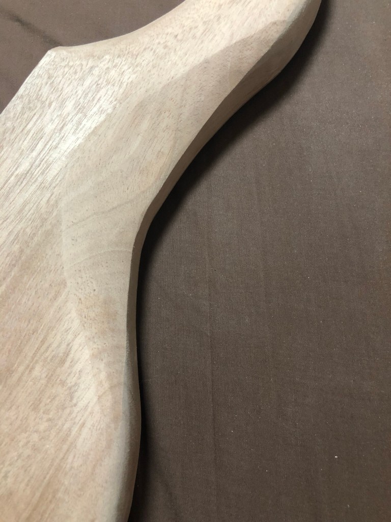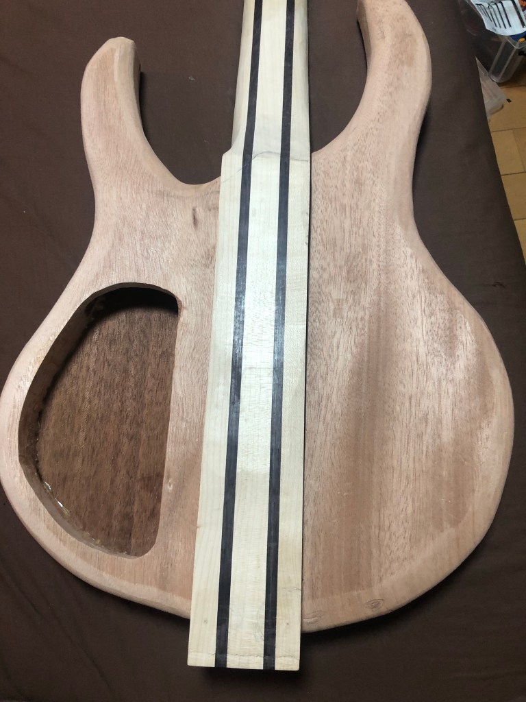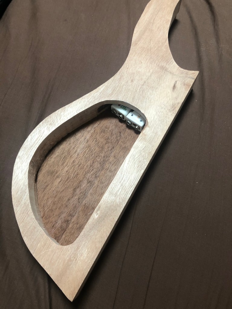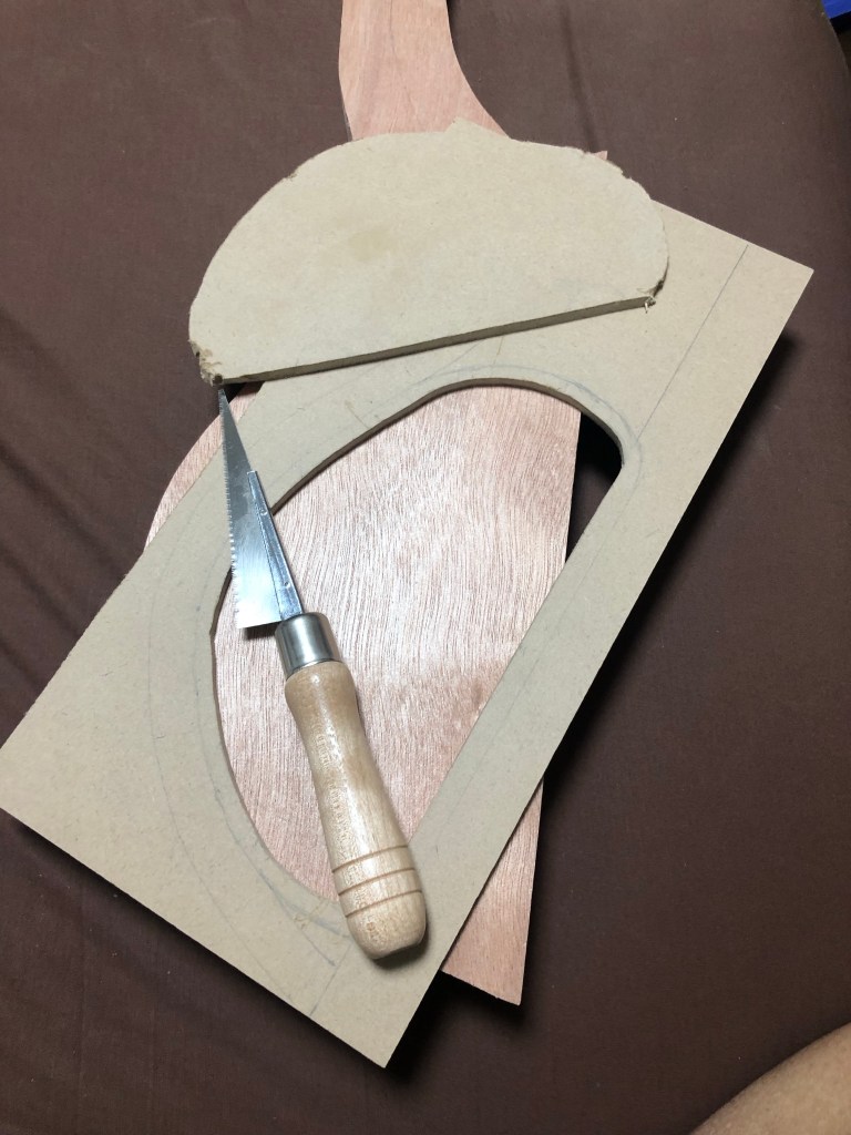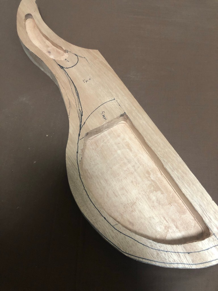 ベースキットの製作ボディ加工編 バンドソーとサンダーだけでここまで加工したが、いよいよルーター 加工となる。ルーター は危険で、何よりうるさいので、加工時間には気をつかった。 ボディウィング材、中は大きくくり抜く。重量を抑える為と、コントロールを入れる為である。 一応MDF材でテンプレートを作成 バックパネル部とキャビティ。 トップ材で隠れるが、電池はこのように収める予定 裏側から。トップ材を貼り付けた後の電池収納イメージ。 トップ材を貼り付け、Rを付け始めた状態。ボディの材とトップの材のあいだにトチとウォールナットの突板を入れてアクセントにしているのだが、わかるかな? これはラミネート構造がよくわかる。左からマホガニー、ウォールナット突板、トチ突板、トップ材ブビンガ スルーネックの裏がバンドソーで切ったままで、ガタガタなので、手カンナで均していく。 ボディエンドは、余裕があるので、何か加工しよう… ボディウィングにコンターを入れていく ボディウィング左右とも コンターの状態。あまり削り過ぎると中空なので、穴に達してしまうかも… 共有: X で共有 (新しいウィンドウで開きます) X Facebook で共有 (新しいウィンドウで開きます) Facebook いいね 読み込み中…
