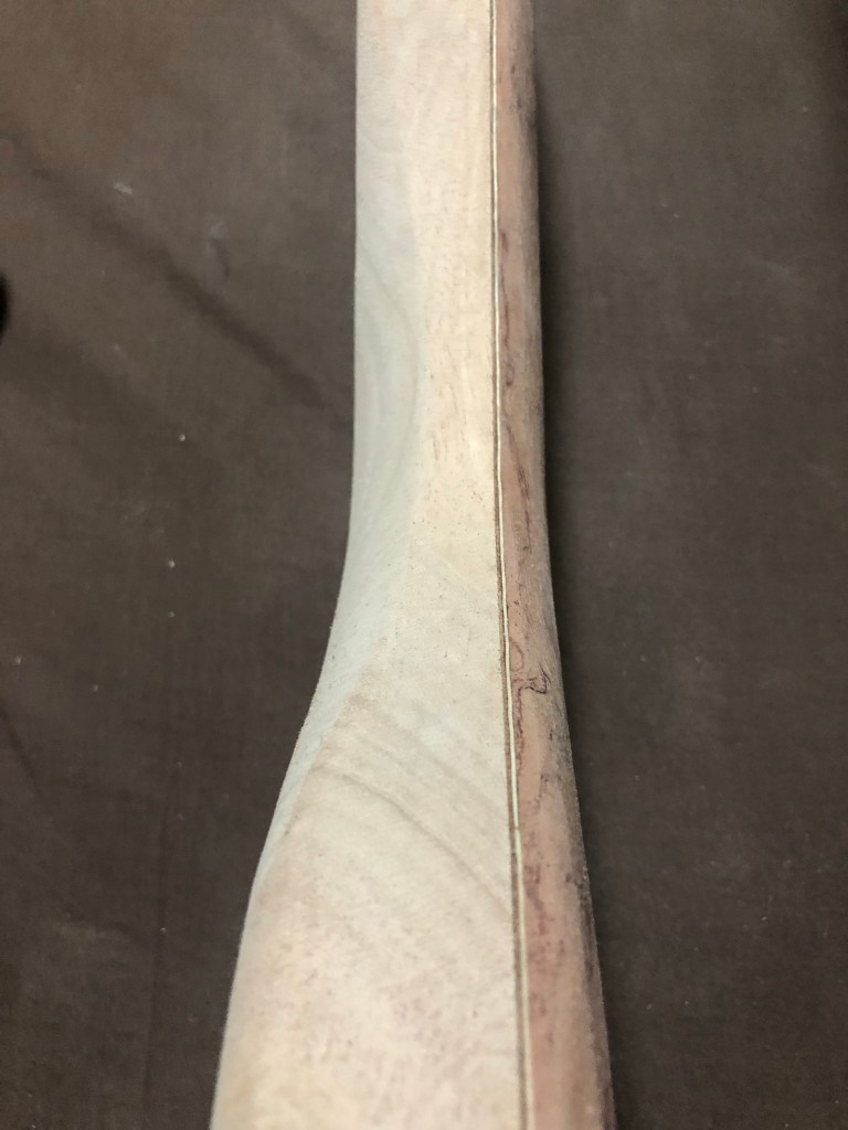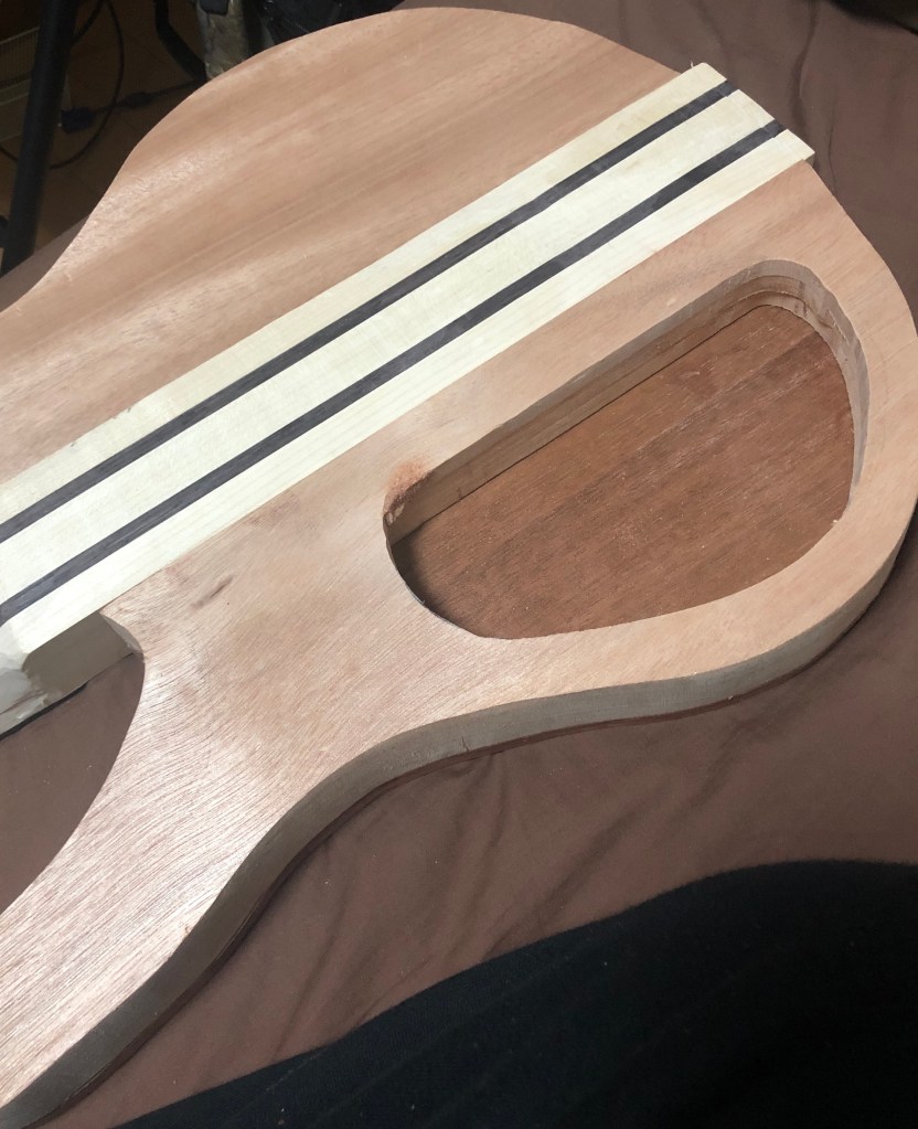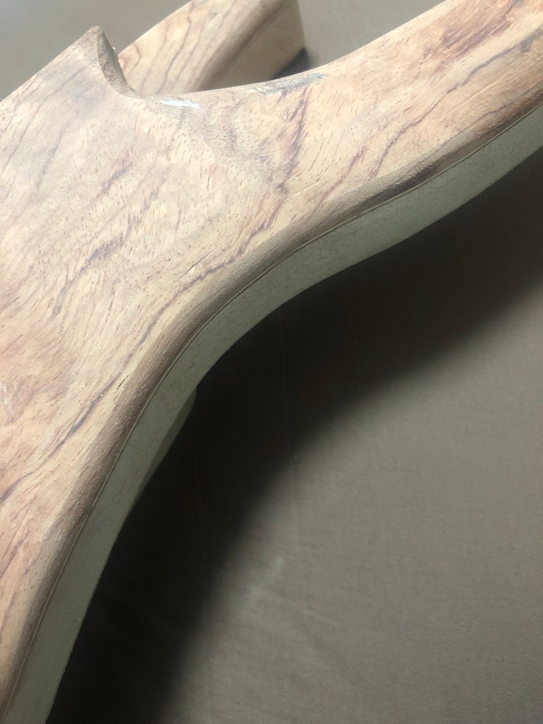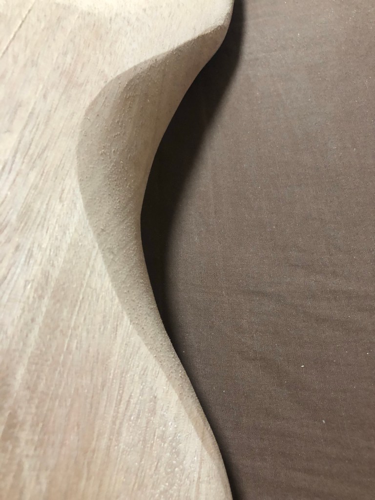 ベースキットの製作ボディ加工編 バンドソーとサンダーだけでここまで加工したが、いよいよルーター 加工となる。ルーター は危険で、何よりうるさいので、加工時間には気をつかった。 ボディウィング材、中は大きくくり抜く。重量を抑える為と、コントロールを入れる為である。 一応MDF材でテンプレートを作成 バックパネル部とキャビティ。 トップ材で隠れるが、電池はこのように収める予定 裏側から。トップ材を貼り付けた後の電池収納イメージ。 トップ材を貼り付け、Rを付け始めた状態。ボディの材とトップの材のあいだにトチとウォールナットの突板を入れてアクセントにしているのだが、わかるかな? これはラミネート構造がよくわかる。左からマホガニー、ウォールナット突板、トチ突板、トップ材ブビンガ スルーネックの裏がバンドソーで切ったままで、ガタガタなので、手カンナで均していく。 ボディエンドは、余裕があるので、何か加工しよう… ボディウィングにコンターを入れていく ボディウィング左右とも コンターの状態。あまり削り過ぎると中空なので、穴に達してしまうかも… 共有: X で共有 (新しいウィンドウで開きます) X Facebook で共有 (新しいウィンドウで開きます) Facebook いいね 読み込み中…